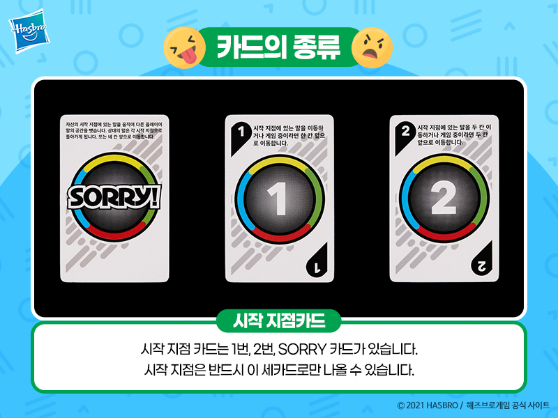 시작 지점 카드는 1번 카드 5장, 2번 카드 4장, SORRY카드 4장이 들어있습니다.