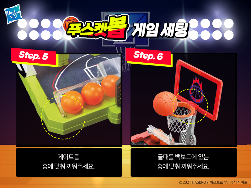 Step. 6! 농구 골대를 백보드의 구멍에 맞춰 끼워 주세요!