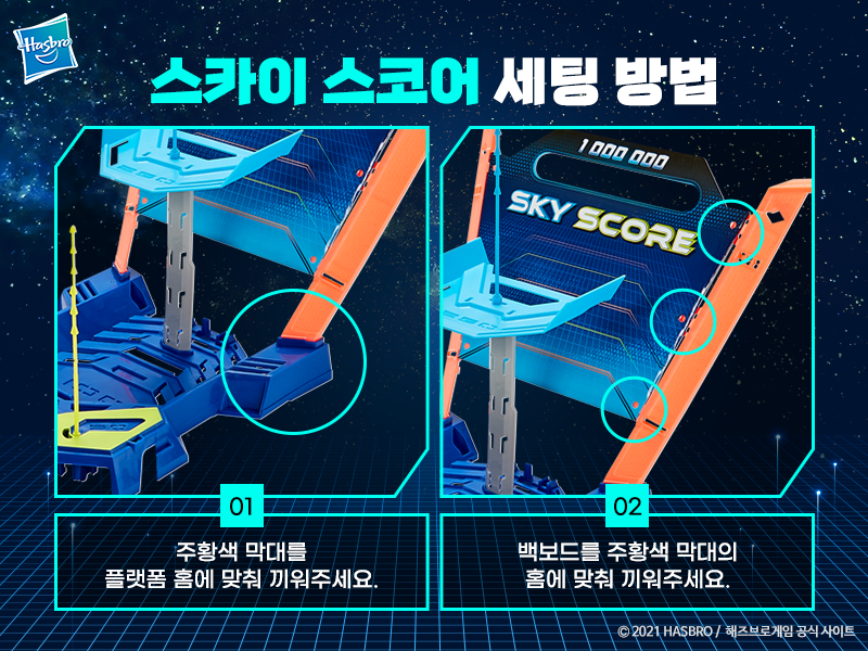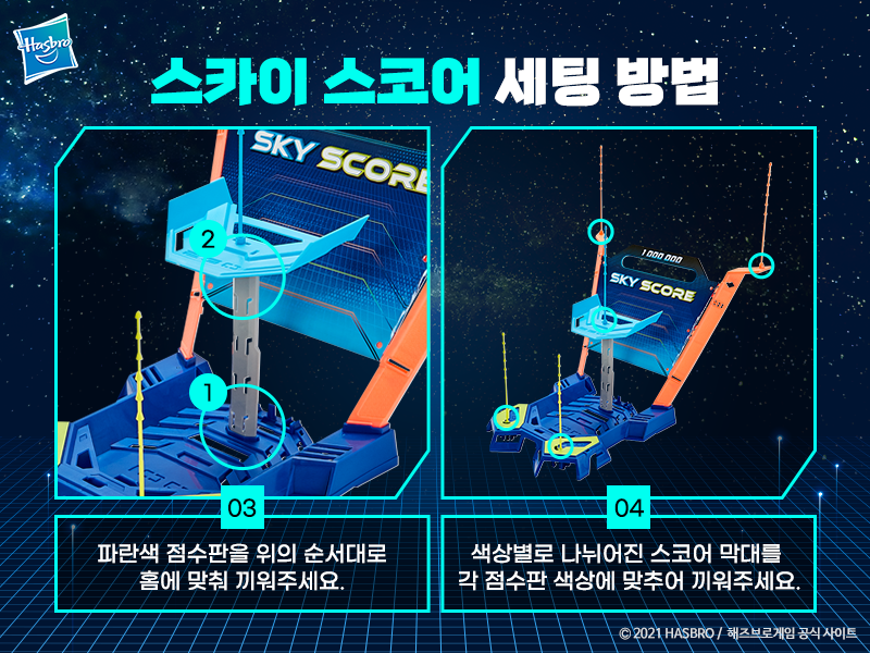 파란색 점수판을 회색 지지대 위에 맞춰주세요!