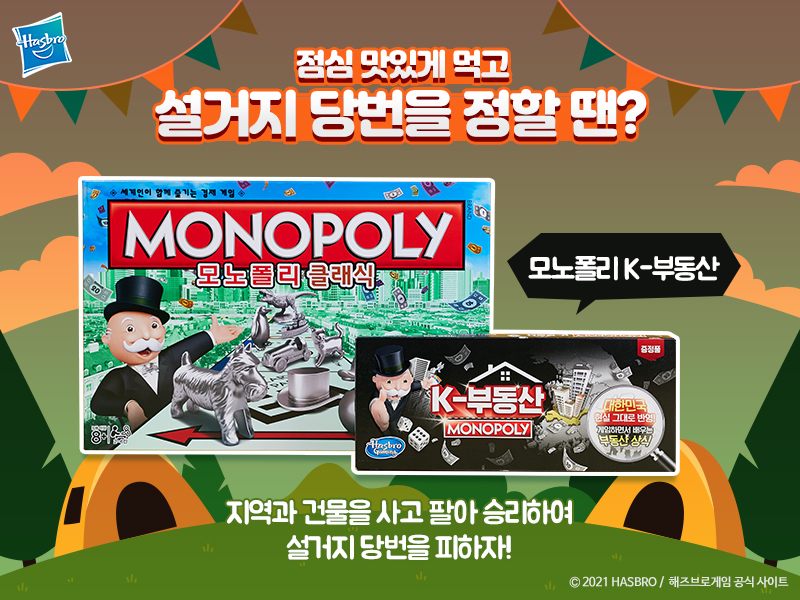설거지 당번을 정할 다음 게임은 모노폴리 K-부동산이에요!