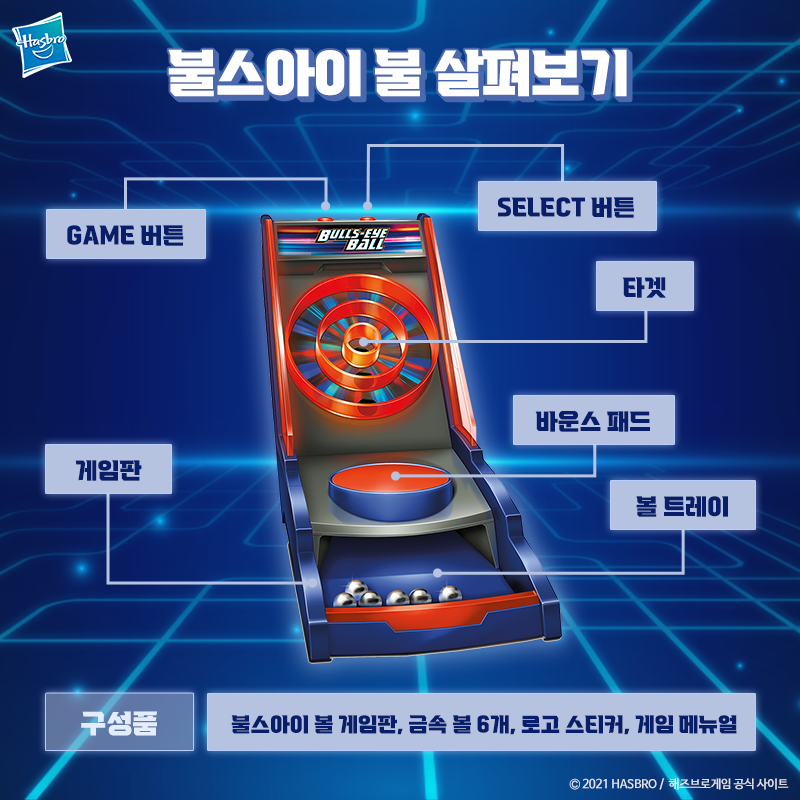 구성품은 불스아이 볼 게임판, 금속볼 6개,