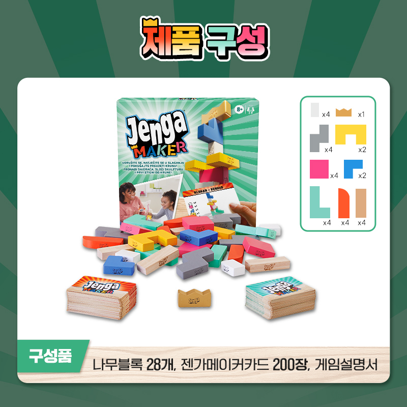 나무블록과, 젠가 메이커 카드 총 200장, 게임 설명서로 구성되어 있습니다!